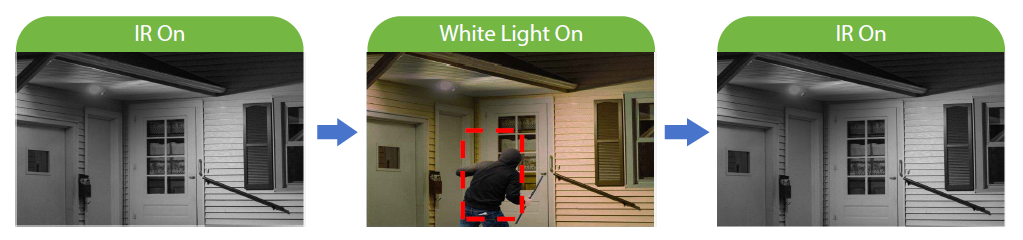 The IR illuminator is normally on at night. When the target is detected by the camera, the white light turns on and the camera records the full-color video and information of key events. When the target is out of the monitored area, the white light turns off and the IR illuminator turns back on, which helps reduce light