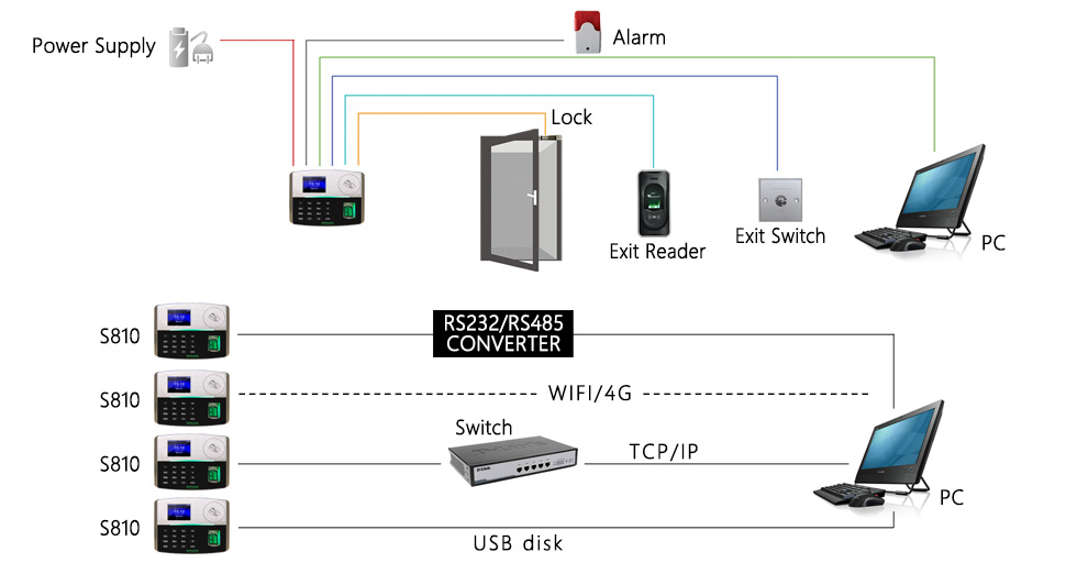 The S810 is the latest multi-verify biometric time attendance, standard support fingerprint and card. Support both network and standalone, wireless 4G/WIFI, makes communication with PC easier. USB flash driver for offline data management. Higher-speed CPU, newest fingerprint and Palm Algorithm, friendly user-interface make operation much comfortable. Built-in battery provides approx 3-4 hours operation for power failure.